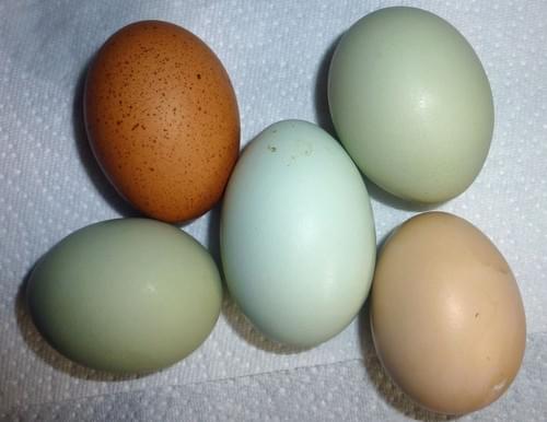 Easter Eggers lay eggs that are various shades of blue, green, pink, gray, and brown.